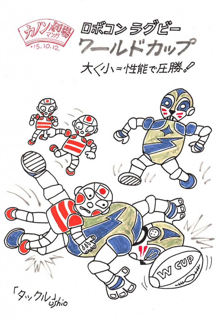 タックル 快進撃の日の丸ラガーのWカップ1次リーグ戦はまさかの戦績で第3位だったけど、 外国の大型選手を圧倒する勢いで、ここまで頑張るなんて誰が予想しただろうか。 秋空のようにスカーっとした気分だった。 これがロボコンの試合だったら、物づくりの日本の面子にかけても勝たせたいなァ。 2015年 10月 12日 Tagged on: ラグビー, ロボコン, ワールドカップ By ブログ管理人 | 2015年10月12日 | まんが, 時事, 秋, 風刺 | No Comments | ← ムカデ 家族 → コメントを残す コメントをキャンセル メールアドレスが公開されることはありません。 * が付いている欄は必須項目ですコメント 名前 * メール * サイト 次回のコメントで使用するためブラウザーに自分の名前、メールアドレス、サイトを保存する。