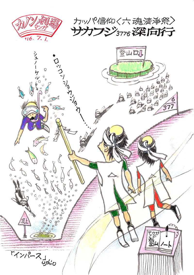 インパース またもカッパニュース。 “水中で山開き”なんて?でしょう。 富士山クラスの深度を誉るサカサ潜りがカッパランド信仰の一つ、 素潜りで377mを行うのが六魂清浄祭としてヤンガーに人気です。 サカサフジだって…。 2016年 7月 1日 Tagged on: カッパ, 富士山, 山開き By ブログ管理人 | 2016年7月1日 | まんが, 夏, 風刺, 風物詩 | No Comments | ← オニ ウィンドキッド → コメントを残す コメントをキャンセル メールアドレスが公開されることはありません。 * が付いている欄は必須項目ですコメント 名前 * メール * サイト 次回のコメントで使用するためブラウザーに自分の名前、メールアドレス、サイトを保存する。