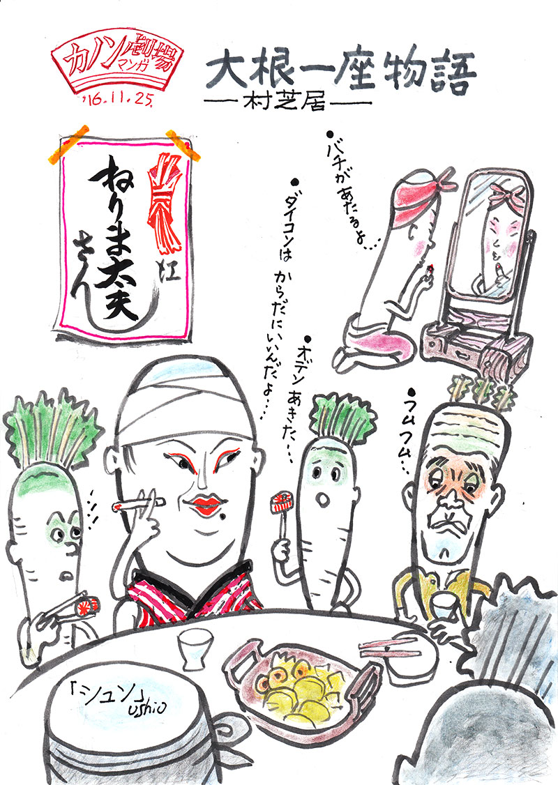 シュン どさまわりのねりま太夫一座にファンから旬の大根がよく届けられるので、 食卓は大根尽くしが続く。 子たちはうんざりしているのを見て、座長は苦笑いするしかない。 何かと巡業を乗り越えなくっちゃ…と。 2016年 11月 25日 Tagged on: ねりま, 大根, 巡業 By ブログ管理人 | 2016年11月25日 | まんが, 冬, 風刺, 風物詩 | No Comments | ← オピニオン アラーム → コメントを残す コメントをキャンセル メールアドレスが公開されることはありません。 * が付いている欄は必須項目ですコメント 名前 * メール * サイト 次回のコメントで使用するためブラウザーに自分の名前、メールアドレス、サイトを保存する。