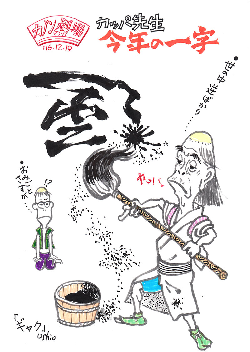 ギャク 地上界では、今年の一字に『金』が当てられた。 こちらカッパランドでは『逆』の一字が。 世の中があまりにもサカサマな事ばかり起き続けているので 大先生の一筆がひかる。 この一文字から何を読み取るかは 次なる世相に反映されてゆくことだろう。 2016年 12月 19日 Tagged on: カッパ, カッパランド, 今年の一字, 大先生 By ブログ管理人 | 2016年12月19日 | まんが, 冬, 時事, 風刺, 風物詩 | No Comments | ← インフル トウジ → コメントを残す コメントをキャンセル メールアドレスが公開されることはありません。 * が付いている欄は必須項目ですコメント 名前 * メール * サイト 次回のコメントで使用するためブラウザーに自分の名前、メールアドレス、サイトを保存する。