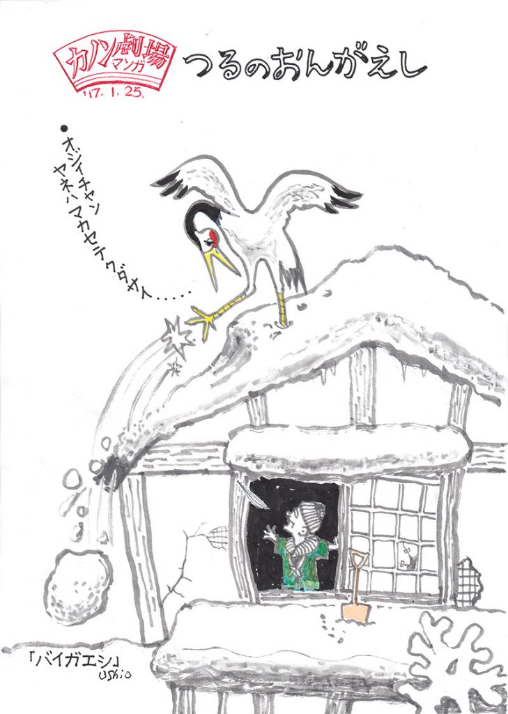 バイガエシ 西日本の大雪にてんやわんやの世の中。 高齢化社会となって屋根の雪下ろしは命がけ。 そこに現れたのは親ツルの命を救われたことがあったツルの 恩返しにじいちゃんびっくらしています。 昔ではなく今のはなしです。 2017年 1月 2日 Tagged on: ツル, 大雪, 西日本, 高齢化社会 By ブログ管理人 | 2017年1月25日 | まんが, 冬, 災害, 風刺, 風物詩 | No Comments | ← カンノイリ メモリアル → コメントを残す コメントをキャンセル メールアドレスが公開されることはありません。 * が付いている欄は必須項目ですコメント 名前 * メール * サイト 次回のコメントで使用するためブラウザーに自分の名前、メールアドレス、サイトを保存する。