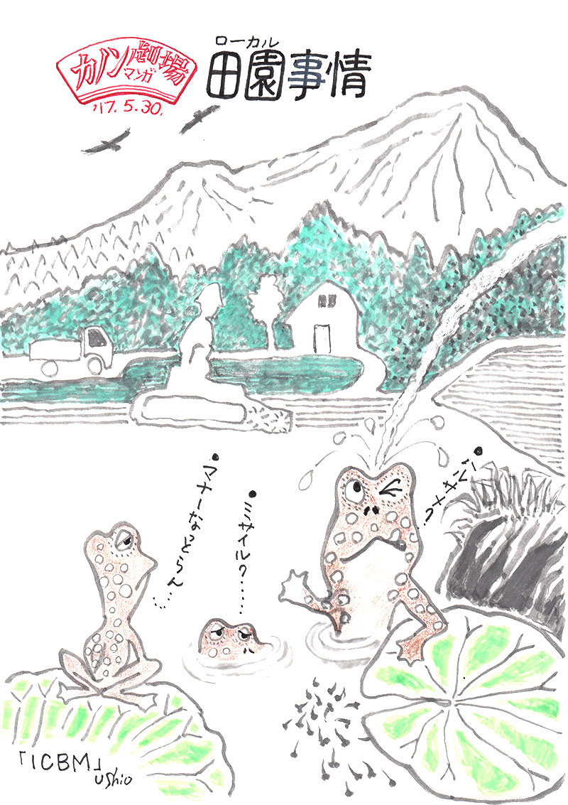 ICBM 畑や田んぼ仕事に忙しい農家は、 長い冬の眠りから活動の季節に突入する。 オシッコするのもモドカシイくらい。 温(ぬる)んできた水の中でケロンパが唄などうたっていると ナマヌルイ水が放たれて顔に命中! ミサイルみたいに。 2017年 5月 30日 Tagged on: カエル, 田んぼ, 農家 By ブログ管理人 | 2017年5月30日 | まんが, 春, 時事, 風刺, 風物詩 | No Comments | ← ルール オヤコ → コメントを残す コメントをキャンセル メールアドレスが公開されることはありません。 * が付いている欄は必須項目ですコメント 名前 * メール * サイト 次回のコメントで使用するためブラウザーに自分の名前、メールアドレス、サイトを保存する。