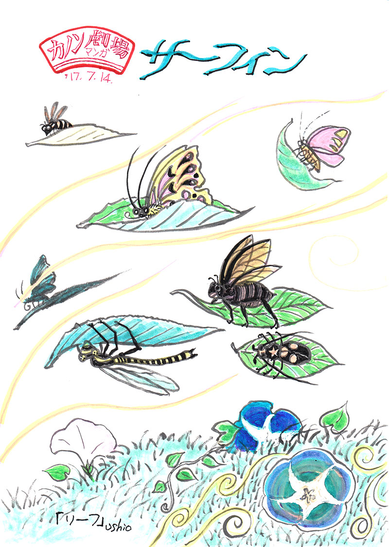 リーフ 夏嵐──緑の間をぬって少し強い風が吹きわたる。 風の通り道があって木の葉にのった虫たちのサーフィンがはじまる。 自分の羽根で飛ぶのと違って思いがけないコトが起こる 葉〈リーフ〉のボードで翔ぶのではドッキリ感が違うのかも…。 2017年 7月 14日 Tagged on: サーフィン, 葉, 虫, 風 By ブログ管理人 | 2017年7月14日 | まんが, 夏, 風物詩 | No Comments | ← ヨサコイ バージン → コメントを残す コメントをキャンセル メールアドレスが公開されることはありません。 * が付いている欄は必須項目ですコメント 名前 * メール * サイト 次回のコメントで使用するためブラウザーに自分の名前、メールアドレス、サイトを保存する。