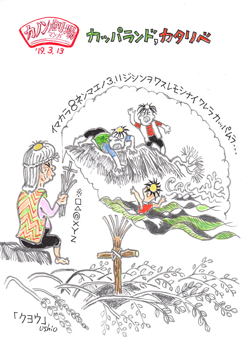 クヨウ 歴史的大地震に痛めつけられたのは、 ここカッパランドも同じです。 地下王国のカッパ族は小さな地震にも 神経をとがらせて暮らしています。 3.11の震災記念日は当然祈りの時をもちました。 曲ッ渕(まがっぷち)の語り部バンバはあの日以来 地震と津波の怖さを伝え続けています。 2019年 3月 13日 Tagged on: 3.11, カッパ, カッパランド, 地震, 津波, 震災 By ブログ管理人 | 2019年3月13日 | まんが, 春, 東日本大震災, 災害, 風刺 | No Comments | ← リスク マーキング → コメントを残す コメントをキャンセル メールアドレスが公開されることはありません。 * が付いている欄は必須項目ですコメント 名前 * メール * サイト 次回のコメントで使用するためブラウザーに自分の名前、メールアドレス、サイトを保存する。