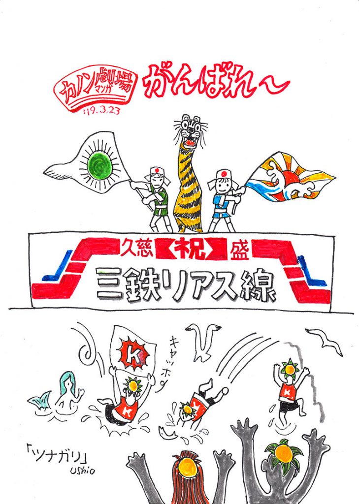 ツナガリ 北の被災地三陸海岸の鉄路が復興しました。 朝ドラの“あまちゃん”で知られた北の海女の地、 久慈駅と大船渡の盛駅を結ぶ163キロがつながりました。 カッパランドもリアス線開通を密かにお祝いしました。 がんばれ三陸!! 2019年 3月 23日 Tagged on: あまちゃん, リアス, 三陸海岸, 久慈駅, 海女, 盛駅 By ブログ管理人 | 2019年3月23日 | あまちゃん, まんが, 春, 時事, 東日本大震災, 災害, 風刺, 風物詩 | No Comments | ← ワライ カモク → コメントを残す コメントをキャンセル メールアドレスが公開されることはありません。 * が付いている欄は必須項目ですコメント 名前 * メール * サイト 次回のコメントで使用するためブラウザーに自分の名前、メールアドレス、サイトを保存する。