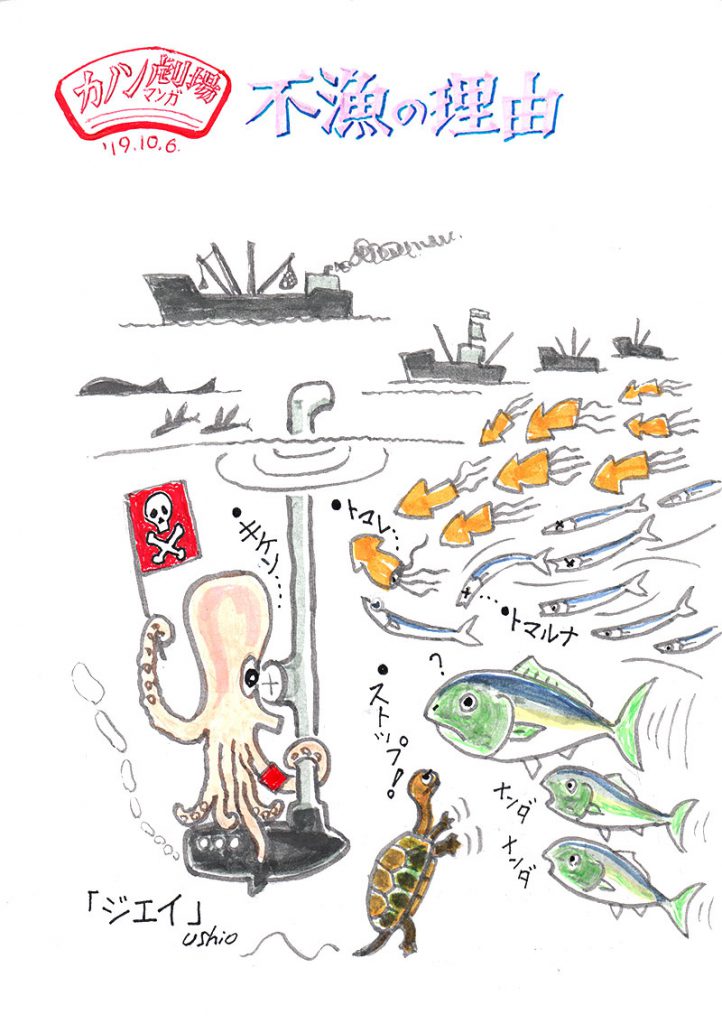 ジエイ 少子化は海の世界とて同じ、 魚類の少子の原因は人間によって 大量に捕らえられてしまうこと。 そんならそれなりに対応しなくちゃと 自衛の手段が始まった。 常に動き続けないと病気になるのを変えさせる役は サブマリンのオクトパス。 責任重大です! 2019年 10月 6日 Tagged on: 少子化, 海, 魚, 魚類 By ブログ管理人 | 2019年10月6日 | まんが, 時事, 風刺 | No Comments | ← ヒガイ ヌクモリ → コメントを残す コメントをキャンセル メールアドレスが公開されることはありません。 * が付いている欄は必須項目ですコメント 名前 * メール * サイト 次回のコメントで使用するためブラウザーに自分の名前、メールアドレス、サイトを保存する。