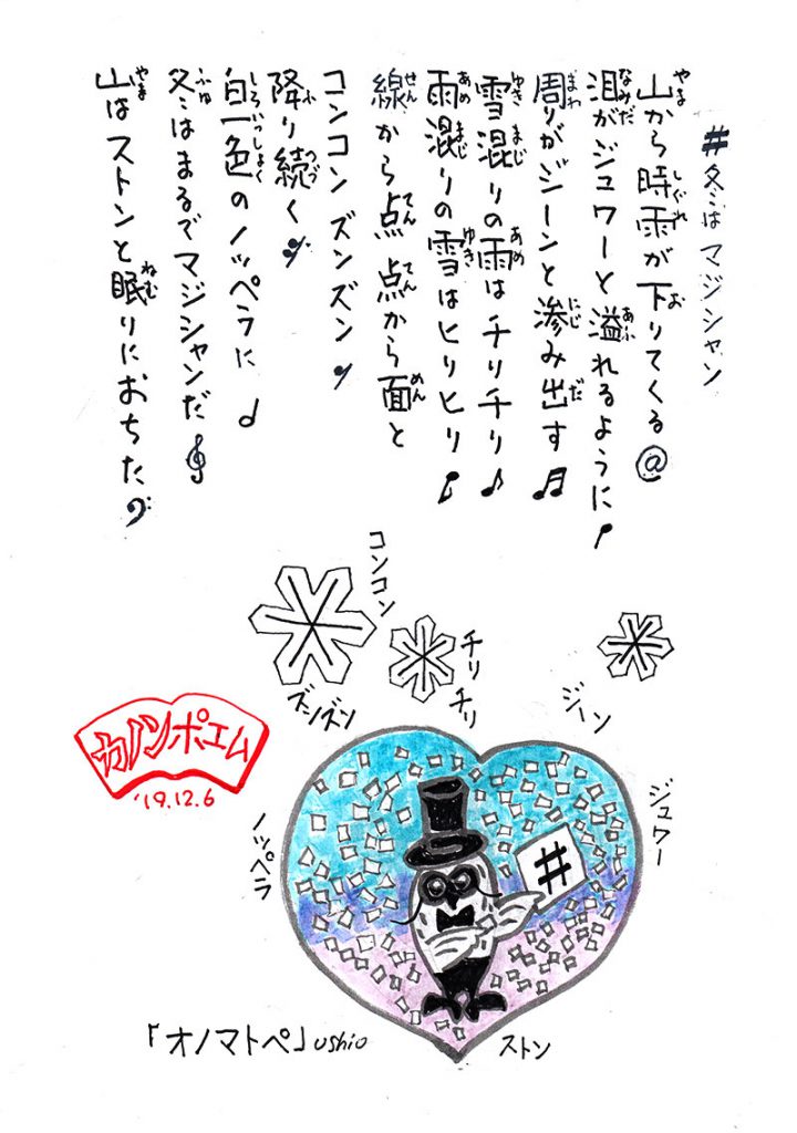 オノマトペ しぐれに誘われるように雪になった。 アッという間に白い世界に変わった。 偉大な奇術師のワザにかかったように、 チリチリ、ヒリヒリ、コンコン、ズンズンなのに 一瞬に変身した。 2019年 12月 6日 Tagged on: 奇術師, 白, 雪 By ブログ管理人 | 2019年12月6日 | ポエム, まんが, 冬, 風物詩 | No Comments | ← ゲリラ ナベ → コメントを残す コメントをキャンセル メールアドレスが公開されることはありません。 * が付いている欄は必須項目ですコメント 名前 * メール * サイト 次回のコメントで使用するためブラウザーに自分の名前、メールアドレス、サイトを保存する。