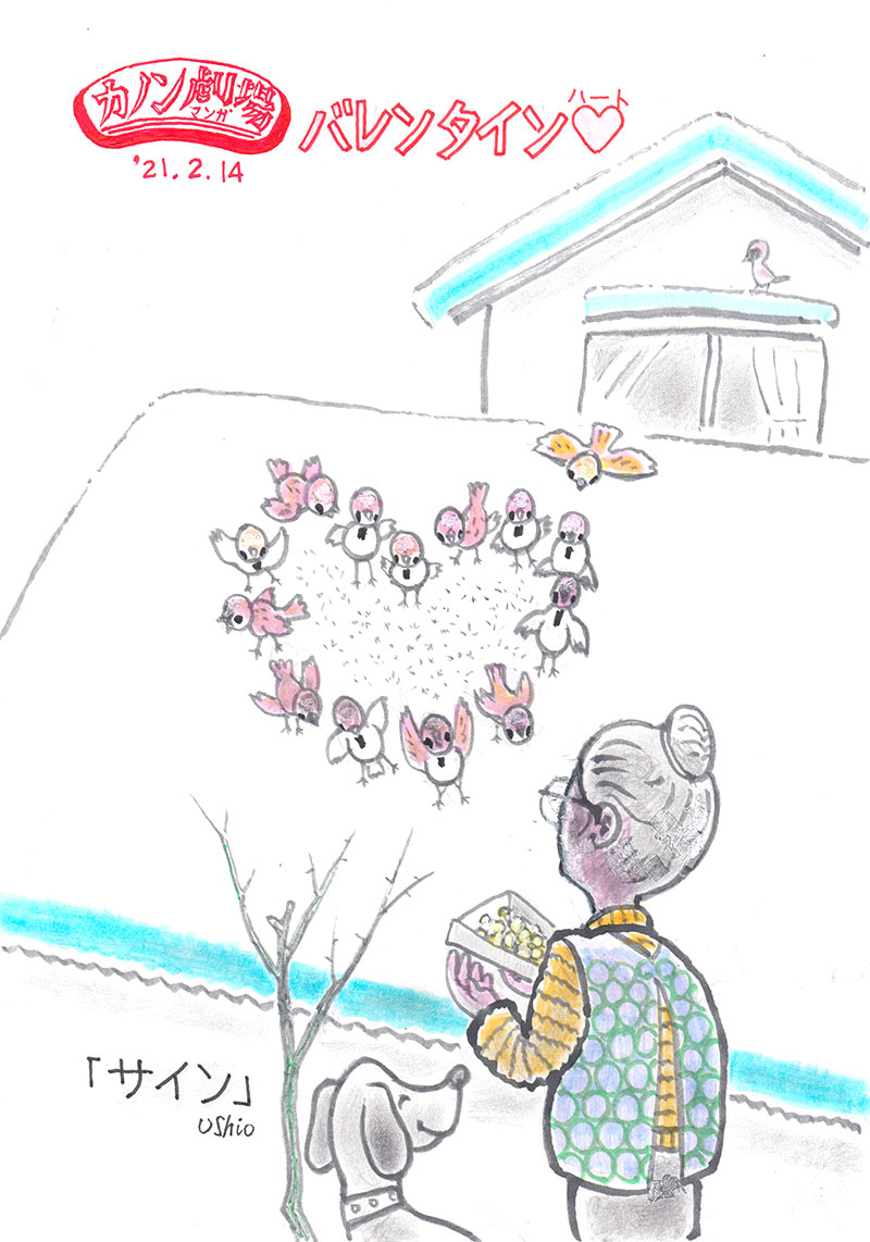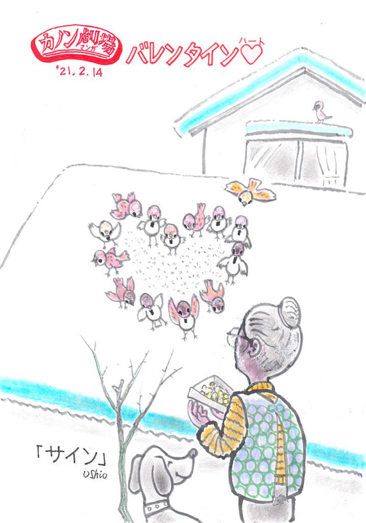 サイン バレンタインディのサプライズ!! なんてかわいいこどもたちでしょう。 いつも餌をくれるバァバに ありがとうのハートマークをつくって、 お礼のサインをくれました。 「たべたらおうち帰りなさいネ」 すずめの学校の先生みたいです。 雪のまぶしい夕暮れどき…。 2021年 2月 14日 Tagged on: スズメ, ハート, バレンタインデー By ブログ管理人 | 2021年2月14日 | まんが, 冬, 記念日, 風物詩 | No Comments | ← キボウ シンド6 → コメントを残す コメントをキャンセル メールアドレスが公開されることはありません。 * が付いている欄は必須項目ですコメント 名前 * メール * サイト 次回のコメントで使用するためブラウザーに自分の名前、メールアドレス、サイトを保存する。