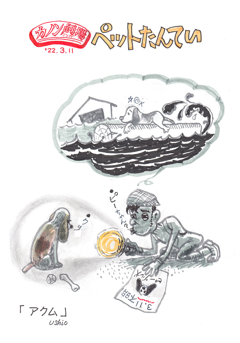 アクム 山のような黒い波がガブのみしてしまう津波の 恐怖と悲しみは毎年やってくる 3.11──。 あの時!目の前を流されてゆく人、物、ペットの 助けを求めている声や目を思い出します。 みんなかけがえのない家族です。 「ペットの探偵」は昼夜探し回ります。 おうちに帰れなくなった家族のために…。 2022年 3月 11日 Tagged on: 3.11, ペット, 津波, 犬, 震災 By ブログ管理人 | 2022年3月11日 | まんが, 時事, 東日本大震災, 風刺 | No Comments | ← ヒサン マスク → コメントを残す コメントをキャンセル メールアドレスが公開されることはありません。 * が付いている欄は必須項目ですコメント 名前 * メール * サイト 次回のコメントで使用するためブラウザーに自分の名前、メールアドレス、サイトを保存する。