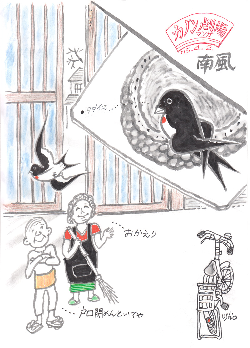 南風 初ツバメの便りが届いた。 例年より5日も早いらしい。 ということは、ツバメの餌となる虫もうごめいているということか…。 温かい南の風は閉じこもった心と体を生き生き甦えさせてくれました。 少々寒くてもツバメの出入口は開け放しておもてなしです。 2015年 4月 2日 Tagged on: ツバメ By ブログ管理人 | 2015年4月2日 | まんが, 春, 風物詩 | No Comments | ← 魂からのネガイに生きる 異変 → コメントを残す コメントをキャンセル メールアドレスが公開されることはありません。 * が付いている欄は必須項目ですコメント 名前 * メール * サイト 次回のコメントで使用するためブラウザーに自分の名前、メールアドレス、サイトを保存する。