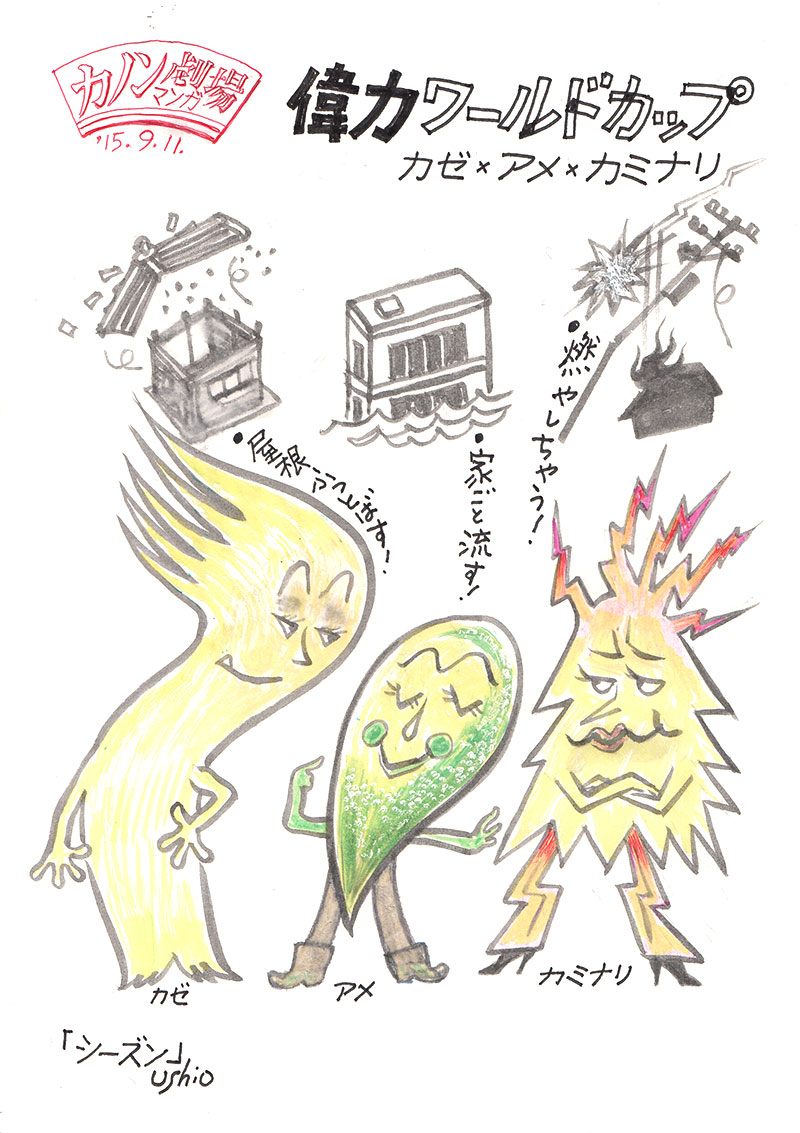 シーズン みずほの国は水に恵まれ過ぎて水に弱い。 今年は特に異常気象で大雨被害に気を揉むニュースばかりです。 台風17号のおまけみたいな震度5の揺れが東京にあったりして、本当におかしいよ。 何かがズレでしまったジャポンです。 秋は要厳重注意!!! 2015年 9月 11日 Tagged on: 台風, 大雨, 異常気象 By ブログ管理人 | 2015年9月11日 | まんが, 災害, 秋, 風刺 | No Comments | ← 火の魂 ロゼッタ → コメントを残す コメントをキャンセル メールアドレスが公開されることはありません。 * が付いている欄は必須項目ですコメント 名前 * メール * サイト 次回のコメントで使用するためブラウザーに自分の名前、メールアドレス、サイトを保存する。